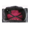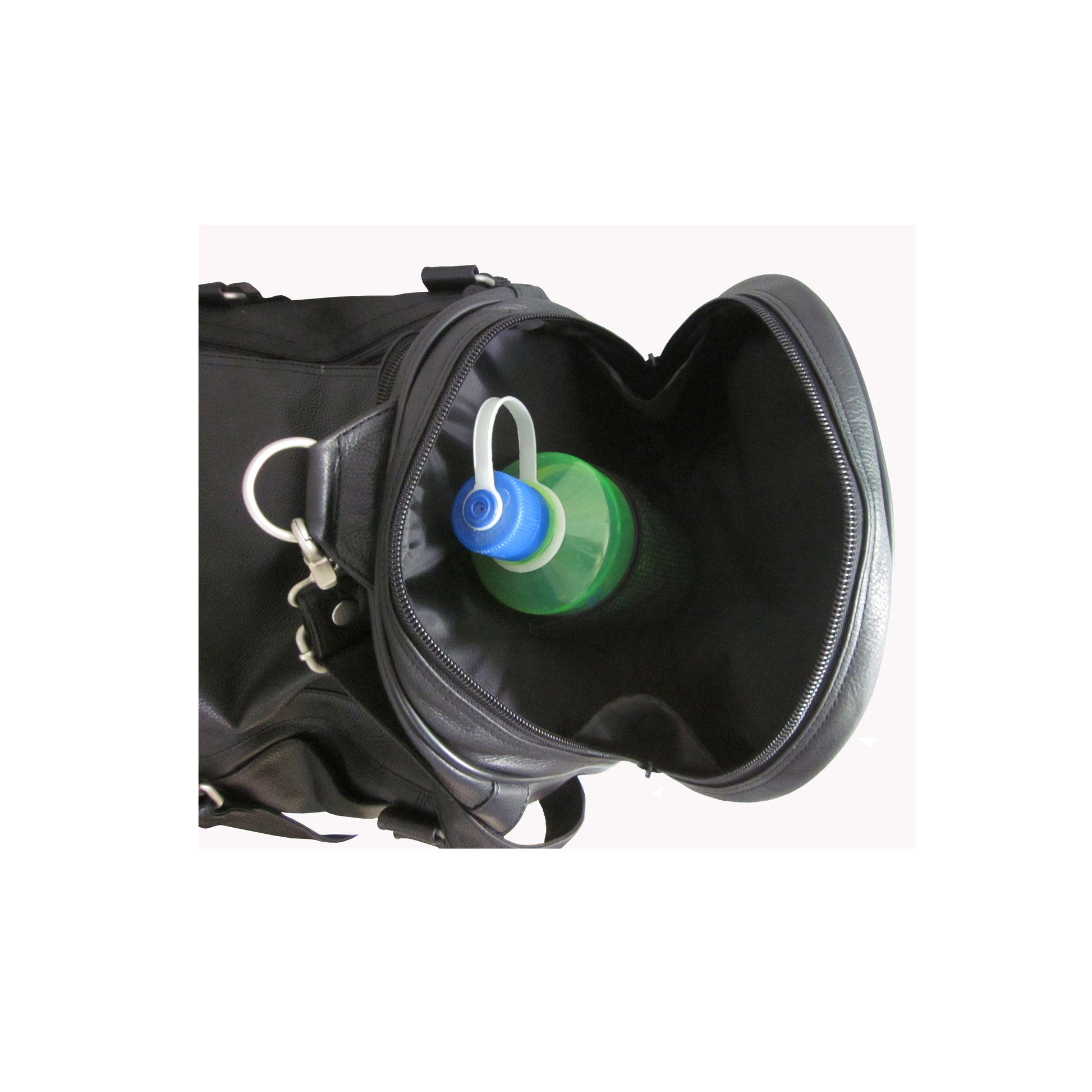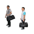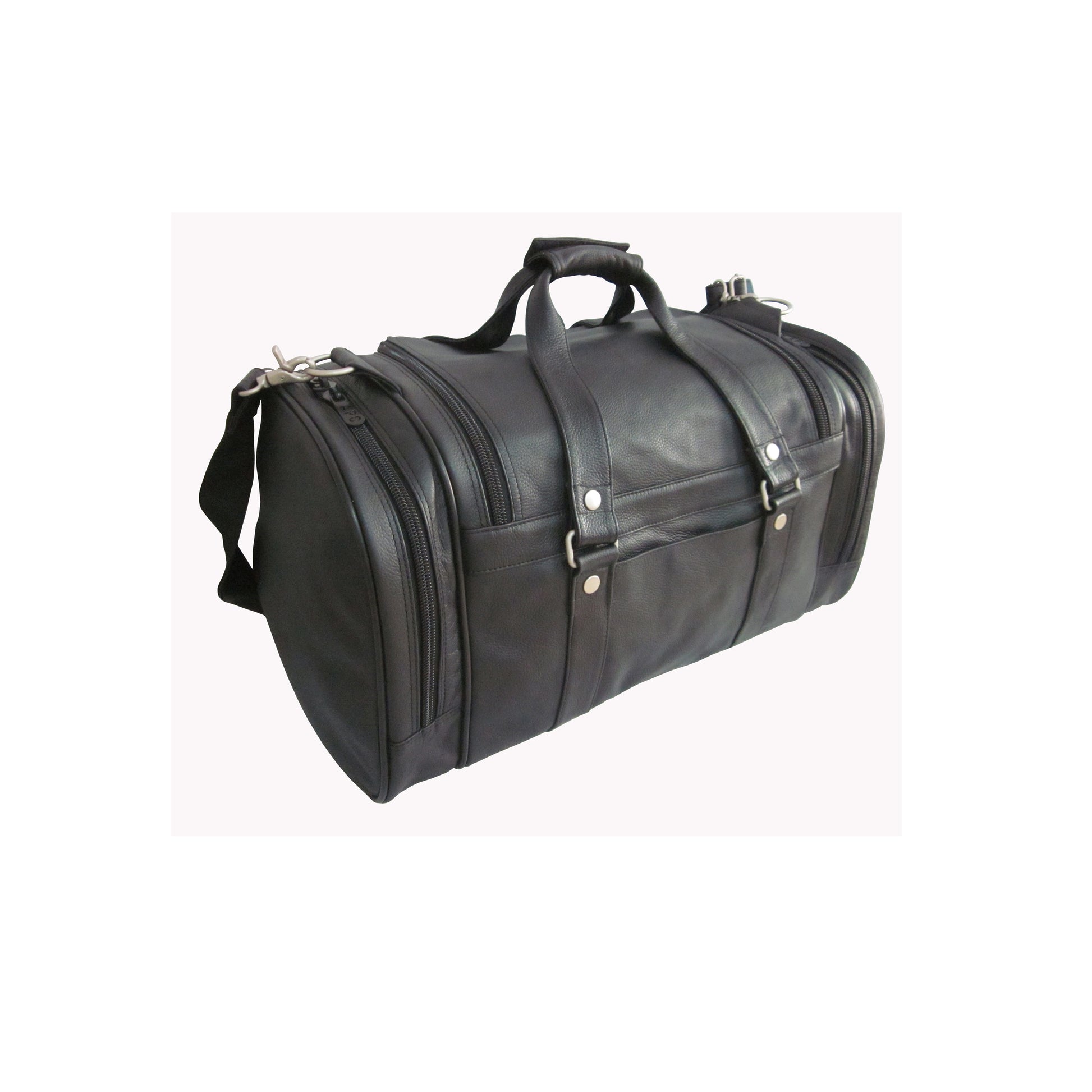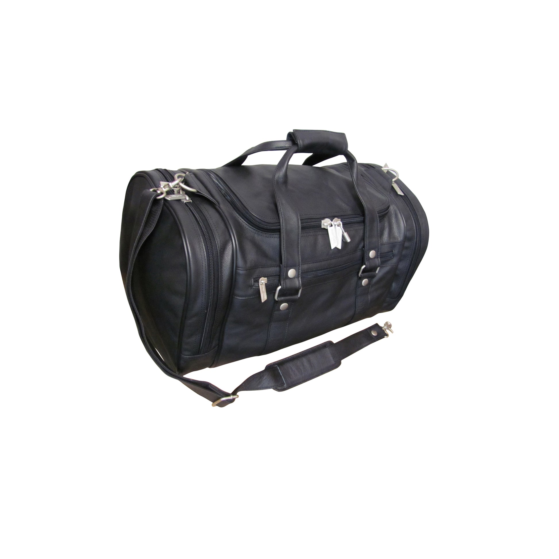 This 22-inch black 'U' zipper duffel has six compartments to separate your possessions, and features an additional two side zipper pockets and detachable leather shoulder strap with a non-slip pad. It also has inside zip pockets and exterior zip pockets.