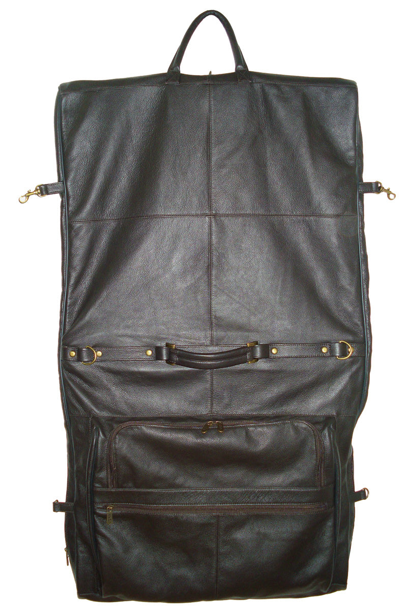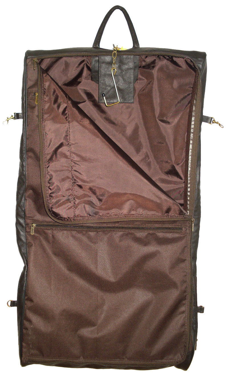 This chestnut brown leather garment bag lets you carry up to three suits comfortably, easily, and stylishly.