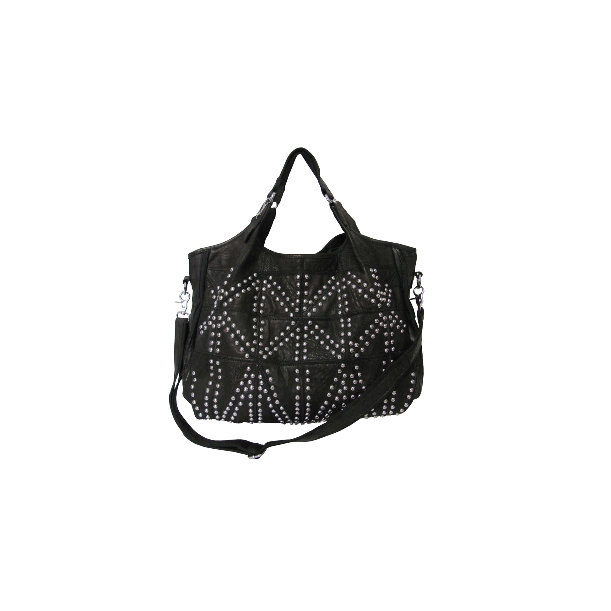 Tote bags inspired by Native American sand-art. Metallic studded adorns the body of this tote bag. The simple beauty will never be out of style. It's sure to last through everyday wear and tear.