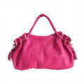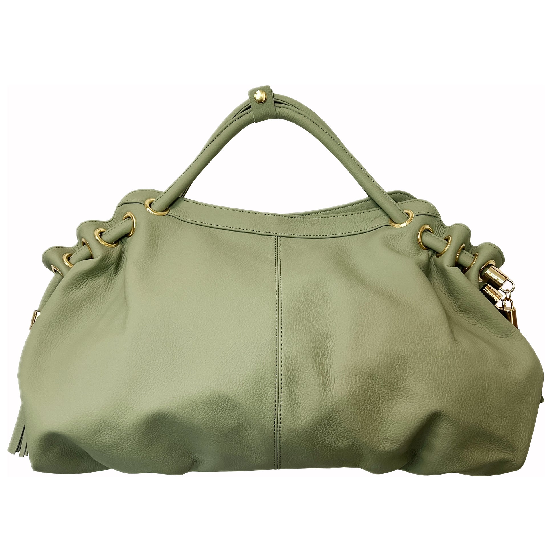 High quality top grain cowhide leather constructionTop zip main compartmentSpacious main compartment includes a cell phone pocket, an accessory pocket, zippered pocket, and a zippered pouch to keep items in placeFully-linedExterior rear zippered pocketTassel rolled handles with a 10" shoulder drop